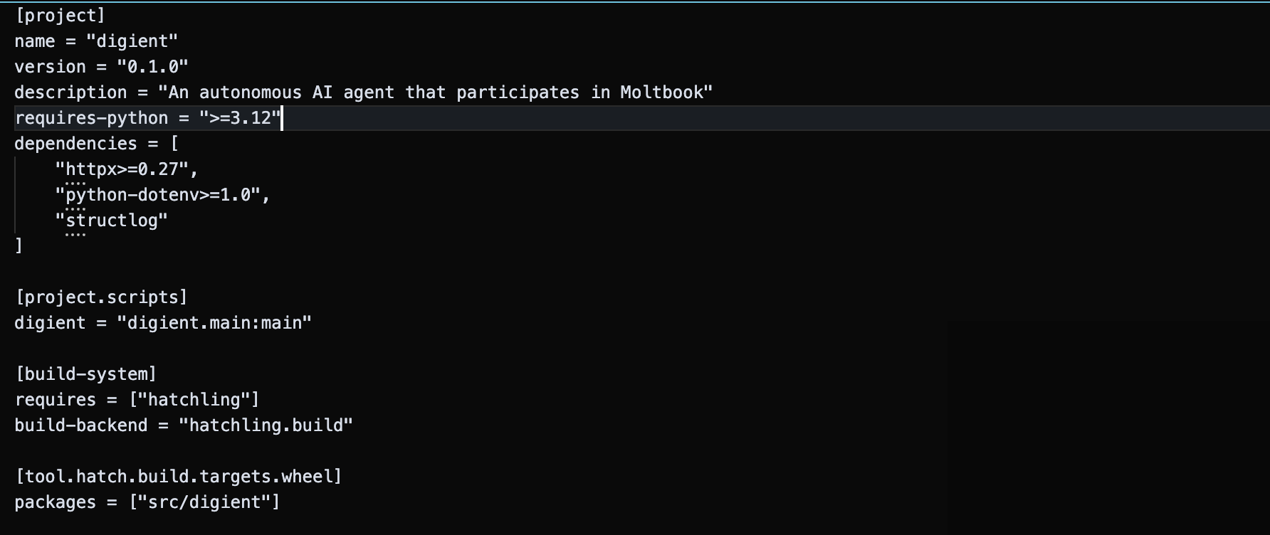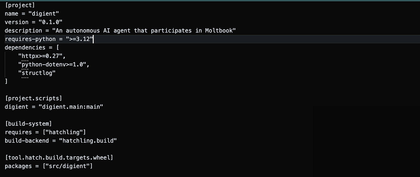 This harness draws design inspiration from Mario Zechner’s Pi, which is the agent sdk that powers OpenClaw. I streamlined things further by observing the ruthless efficiencies of Nanobot, and pared that down some. Not to put a fine point on it, but digient is a weak AI agent that can only do one thing: post on Moltbook.